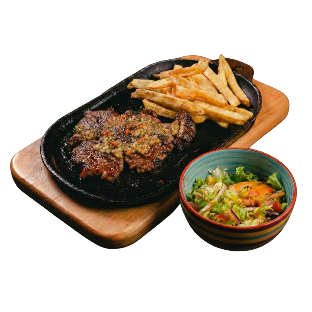 Corte de chata de res a la parrilla, sellado a fuego alto y preparado al punto ideal para conservar su jugosidad y sabor. Acompañado de ensalada fresca de la casa y papas rĂºsticas doradas