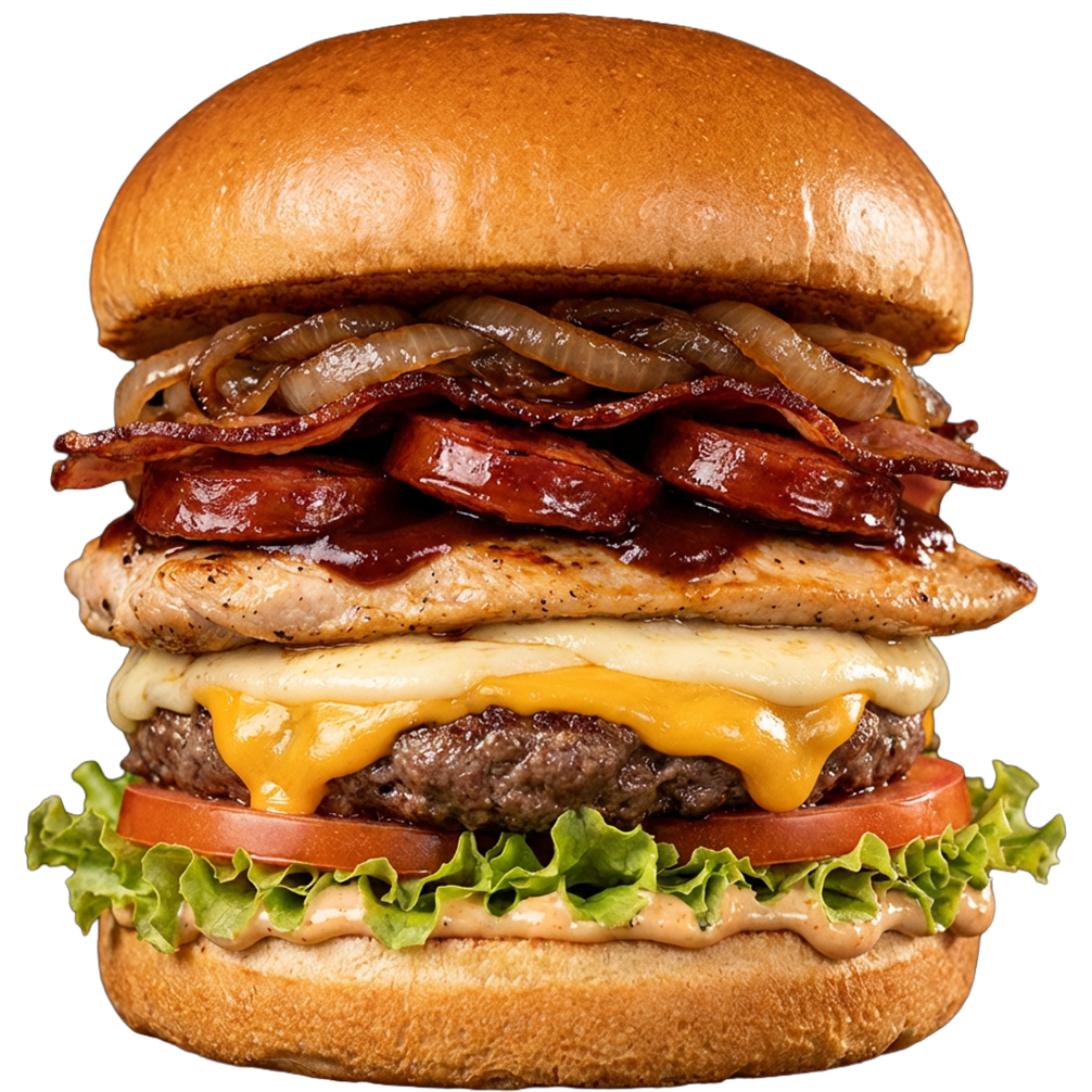 Pan brioche con 150g de carne artesanal, mozzarella, cheddar, filete de pechuga, chorizo en salsa BBQ, tocineta, cebolla caramelizada, lechuga, tomate y salsas de la casa. Incluye papas rĂºsticas.