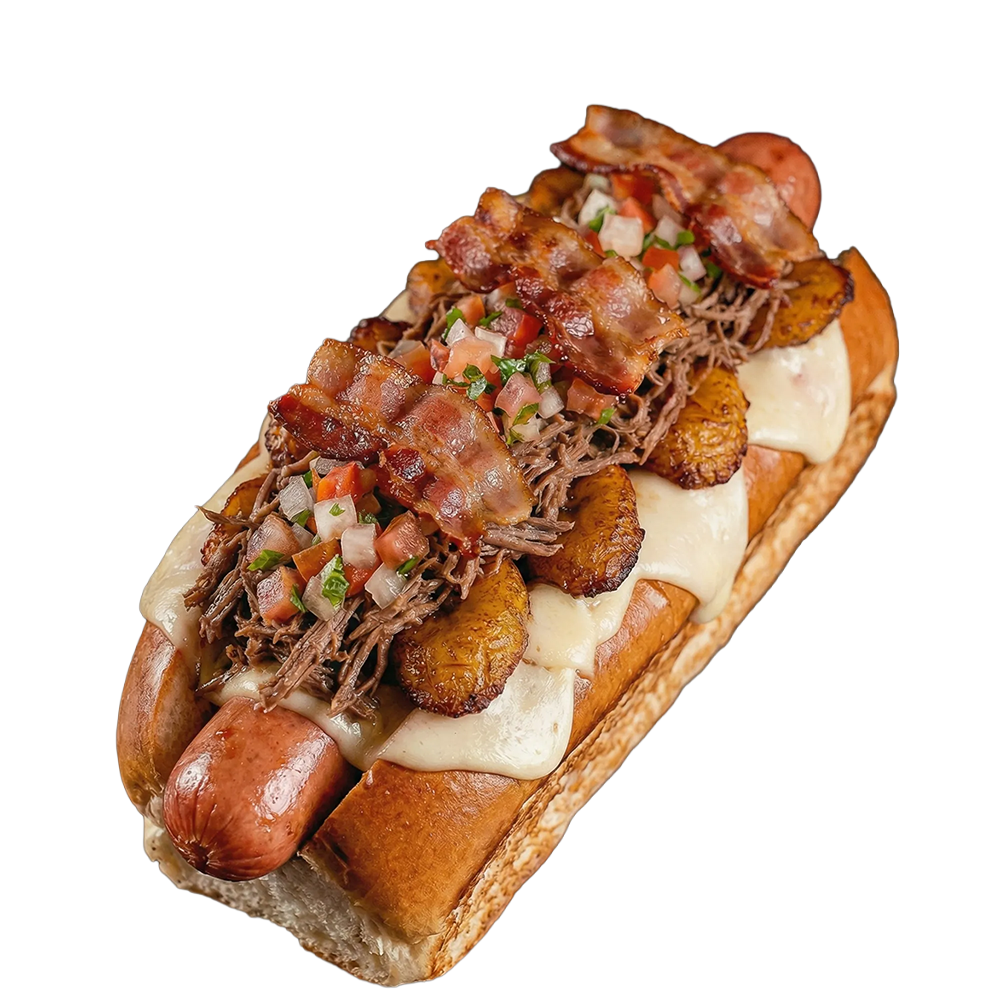 Pan con salchicha americana, carne desmechada, pico de gallo fresco, tocineta, plĂ¡tano maduro, queso fundido y salsas. Acompañado de papas rĂºsticas.